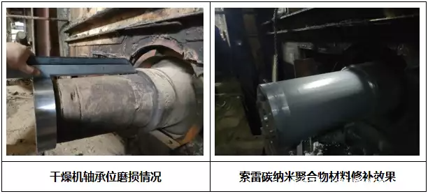 其次,索雷碳纳米聚合物材料技术具有传统修补技术所不具备的快捷性、稳定性及耐用性。在保证质量和使用效果的前提下,我司技术可以大量减少干燥机轴承位磨损修补的时间,同时避免因拆卸整个设备而造成的大量人力、物力及财力的浪费,降低企业停工停产的时间和因停工停产造成的巨大损失。